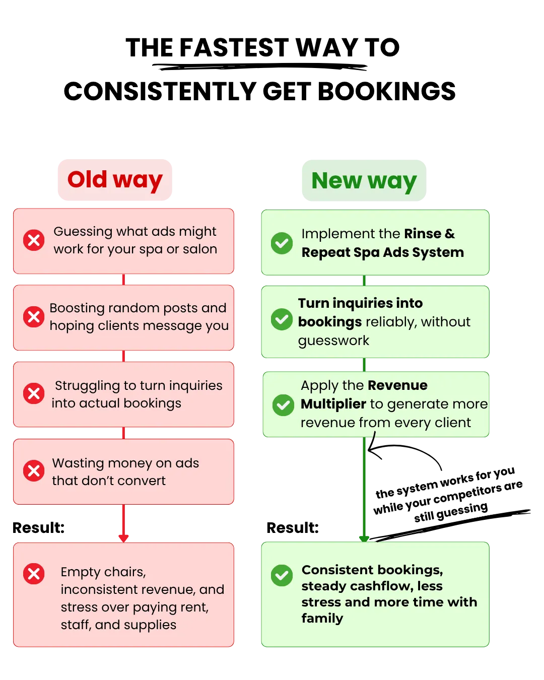 That’s actually common. Most spa owners try ads without a clear system. This shows you a structured approach you can repeat, instead of guessing what might work.